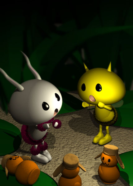 ハチオニ。 泣き虫。怖がり。豆まきが苦手。 不安な気持ちををダンスで表わす ことが好き。 でも、ダンスはあまり上手くない。 プーディ。 ほこり高き生き物。 ハチオニの上位変種。白い皮膚と、 特徴的な体毛。 ハチオニにせがまれて、ダンスを 教えることがある。 こんな風に、草むらの影で・・・。 アカマメ。 土の妖精。ハチオニとちがい、楽天的。 あまり考え事はしない。 なにもしなくても、生きていける のだから。 ハチオニ族の召喚によって姿を現わす。 特技は、火をおこす事。 ハチオニは怖がりだが、旅が好き。 打ち捨てられた空間を、アカマメを連れて旅をする。 アカマメはなにも考えない。 呼ばれて付き添い、火をおこす。 忘れられた種族の彼らにとって、 ハチオニの無限の優しさはこの上なくここちよい。 |