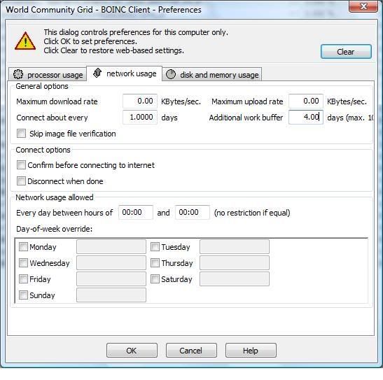 Gerald, you're beyond words. 26 million points is hard to comprehend. Unbelievable work! Dave, congrats too. And thanks for the reminder! With WCG shutting down tomorrow, it is definitely recommended that folks have at least a two day queue of work. Three or four should be more than enough. Once WCG is back up and back in business, that change can be reset. That will allow each of us to keep crunching during the outage. I intend to try to get our raw stats data if at all possible tomorrow before the shutdown. If I'm unable to get the stats data the next day, I'll have to use the same data from the day before meaning everyone has zero numbers for that day. That will probably be the case. When WCG is back, we'll see a spike as the work finally gets counted. Hopefully, it's all going to make a big difference and we won't be having to wait 2-3 hours for the stats update to finish. I just tried to find where to schedule more days of work and just happen to click on the messages for the client. Basically, all of the projects that I am connected to are reporting that there is no work available. I guess my computer is going to get a big break as it's going to be finished with what it has in about 8 hours :( Anyway, where does one go out and schedule more days of work for the computer? If you can't get WCG work units, you can still get BOINC credits. Google search QMC@HOME and you can run quantum chemistry grid computing during the stoppage. Thanks, Jonathan - I will check that out. Just found where to update the work queue - Profiles! Who would have thunk? LOL You can also click on Advanced, Preferences in Boinc Manager and, on the network usage tab, set the "additional work buffer" to a value that, added to the "connect about every" value gives you the total you want (2 days, 3 days, etc.). The plus is after WCG is back, you just click on the Clear button in the top right to wipe those changes out and you can customize this for each machine (can be different values on different machines). The minus is you have to do this on each machine. However, you don't have to change your profile which applies to all your machines. |