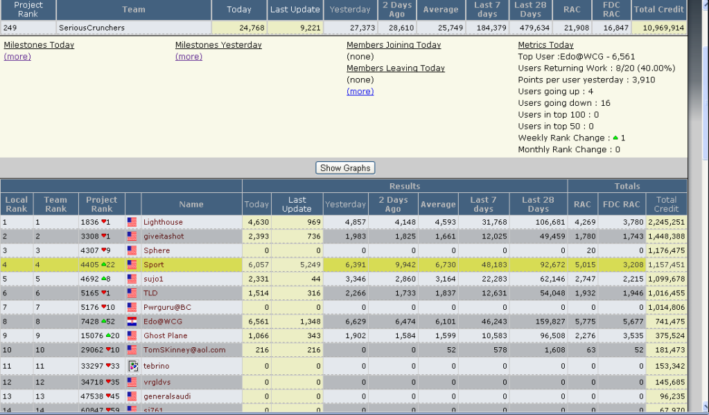 ----------------------------------------For a VERY short time, I'll be Captain of SeriousCrunchers. I want to spend a couple of hours learning as much as I can about the options/obligations before passing the position to Ghost Plane....in the mean time, SC Members and those interested in joining us; below is a quick list of our options for February Challenges. Contact Ghost Plane or myself (I've researched them) or more information Challenge Control Panel Pending and Open Challenges Small Team Race - February 2011; Results Returned; All Projects; 1/31/11 thru 2/28/11 To Eliminate AIDS - Feb. 2011 Points; FightAIDS@Home 1/31/11 thru 2/28/11 February Race 2011; Run Time; All Projects; 2/1/11 thru 2/28/11 Help Conquer Cancer; Points; Help Conquer Cancer; 2/1/11 thru 2/28/11 Help Fight Childhood Cancer; Points; Help Fight Childhood Cancer; 2/1/11 thru 2/28/11 Just a really quick note...Ghost Plane and I will be working closely together for a few days/weeks until we learn to use the tools available(The Control Panel looks pretty simple, but I'm positive there are underlying options or combinations of options that we can maximize...) On that note,SeriousCrunchers has 11 members opted in to receive EMail from the SC@WCG Captain...any one interested please check your Prefs and add that option as there will be a few Team Emails sent in the near future; we PROMISE not to flood your email account! It is totally secure as all Team Email to and from the Captain is sent VIA WCG servers...I think...again I need to learn the tools so I can pass this info along to Ghost Plane ![]() ![]() |