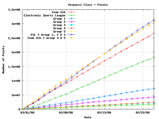 ----------------------------------------![]() The rest of the first Bunny Race graphs are on my Photobucket page. (page 17 and 18 as of this morning) geopsychic This was a pure points race and had entries from teams of all sizes. In a effort to keep it from being a total runaway, we divided the field into groups, then combined the groups. It is perhaps worth pointing out that we decided to do this after the race started and didn't ask anyone if they wanted to be teamed up. We didn't get complaints but I think that may be a reflection of how many people don't read the forums as opposed to the number who thought it was a good idea. The current race is a % increase in points race. I am not sure how to produce an equitable grouping for this type of race. Suggestions are always welcome. [Edit 1 times, last edit by Former Member at Apr 13, 2009 3:23:41 PM] |