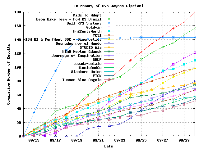 ----------------------------------------Hi, I am new to this forum. We lost our beautiful daughter Ava on April 17th 2007 to Neuroblastoma. We live in Los Angeles, and tried every treatment including MIBG in San Francisco to save her. I am now (I think) on this grid, and hope that all of these efforts will keep other children alive. Ava was 2 1/2 years old when diagnosed, and she fought it for 1 year to the day. I miss her dearly, and at times, I wish that I could join her in heaven. Visit their wesite This is a very touching story. So to all team captains join this challenge: In memory of Ava Jaymes Cipriani |