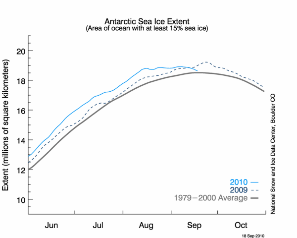 ----------------------------------------... so lets look at Antarctic Ice... the "Your chart with stretched scale for effect", just for laughs, displays that that extra ice was not really holding together. Any idea why? Lacking thickness maybe and as was measured, a declining salinity in the upper layers and as we all know, run off melt-water and lower salinity lets water freeze easier. Does that make sense? As for whatever you perceive to be recovery, the Antarctic is a continent quite a bit bigger than the USofA. When we then take the trends for sea ice there, both area and extent, we find that the annual number is pretty much unchanged compared to the Arctic direction. Here the numbers for the past 10 full years for extent and area 12 months ending August, from the same source as "your chart", in millions km square: YR EXT - AREA '00 12,25 8,82 '01 12,12 8,88 '02 11,50 8,22 '03 12,22 9,00 '04 12,24 8,89 '05 12,11 8,68 '06 11,78 8,49 '07 11,93 8,63 '08 12,71 9,39 '09 12,38 8,98 '10 12,26 9,03 which the scientists had predicted for decades to be lacking global warming... more vapor, more snow, more slipping and sliding and overall Antarctic thickness still declining. For your backfill on information, here's a link to sea ice differentials North and South polar: http://nsidc.org/seaice/characteristics/difference.html with very special attention to the table at bottom doing summary comparison: Global Sea ice is in decline, global snow cover is in decline, and snow-off days are on the rise, glaciers with some exceptions are on decline in surface and in mass. The Globe in short is warming, inexplicably, to you at least. Most consider that it's those mostly living in the UHI's doing being co-responsible... the degree you chose, by your own words opined as "negligible". Are you sure?