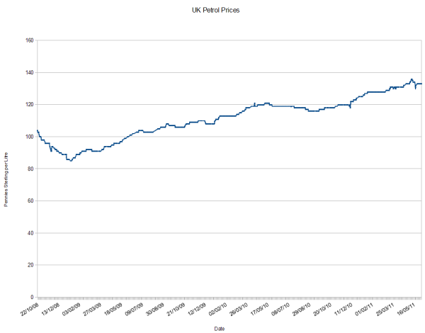 ----------------------------------------I knew those petrolprices.com emails would be useful This is a plot of the cheapest petrol prices in UK pence per litre within 5 miles of where I live(d) since 21st October 2008 ![]() They range from 84.9p/litre to 135.9p/litre an increase in UK transport costs of 60% from 14th January 2009 to the 9th May 2011 ![]() |