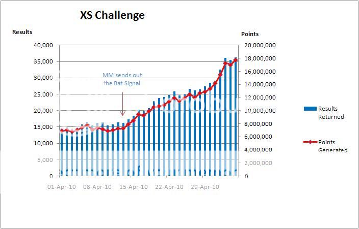 Looking at April 1-13 as a baseline, you averaged about 7.1 Million points, 15,500 results, and nearly 6 Years of run time per day. Your best in that period was about 7.8 Million points, 16,559 results in 6 years 118 days of run time. Your best output from the baseline can't even beat the worst day of your push. From April 14 - May 5, you've averaged 12.2 Million points, 26,000 results, and 10 Years of run time. Your best from this period was 17.8 Million points, 36,228 results in 14 years 163 days of run time. To top it off, that occurred yesterday, so you're still on the upward swing! This graph probably gives you a better sense of magnitude than my words: ![]() Great stuff, Team XS! (Feel free to use any of these numbers or the graph in your home forum. Cheers!) |