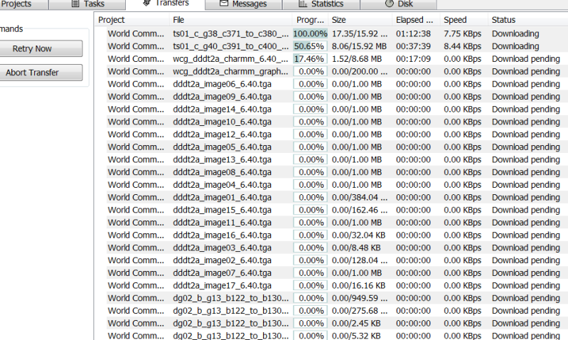 During the attempt to download the 15.9Mb file for each task, the agent will give up, sometimes with an HTTP error in the message log. Retrying the download usually means the 'progress' indicator gets to 100% but the download size goes well beyond the reported size. I have rebooted both machines without any change. On one machine I 'Reset Project'. This cleared the existing workload cache and set up a large number of files to download with respect to the CEP2 project. The larger files in this list also stalled during download, although that is not the case on the other machine. Currently, the machine with the reset agent is reporting no work available and is refusing to download anything while the untouched machine is at least downloading CEP2 tasks. For the record though, it is happily downloading and running a project other than WCG, so I don't think there is a major problem with the agent. I have not seen any status warnings on the forum which connect to my problem other than the ones related to the reverted Linux updated which is marked as Resolved. Is there still a problem on the WCG servers? ![]() |