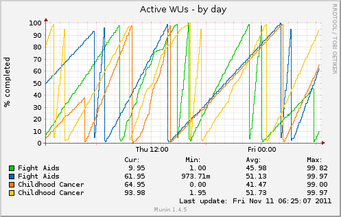 ----------------------------------------Given that your last work-unit result posted was 01/06/12 04:17:33, and your SNURK-sig says "Inactive", this is a very-long-shot of a request, but... waitingForTheMiracle, do you have details for the Munin plugins you used for the top two graphs in your post (active WUs & CPU time by project)? I've been trying to get one of the standard plugins (boinc_processes) working, but not having much joy (even when I try the authentication method it's using manually rather than using the plugin). I've got boinc_credit (credit per project), boinc_estwk (estimated work cache), boinc_wus (workunits by status), and boinc_projs (number of running processes) working, but wanted something that tracked workunit progress, specifically, although the CPU time per project would be useful. Although I'm not too bad with Perl, and could possibly get something bashed together myself, was hoping to find a ready-made plugin that would just drop straight into Munin... EDIT: have now got the boinc_processes running and, unfortunately, it aggregates any projects of the same group - ie. my two WCG workunits (different projects), currently at 82% and 29% progress, are aggregated as one graph point at 111% because BOINC sees them both as WCG workunits - not overly useful, so have removed that plugin. ![]() [Edit 1 times, last edit by Thargor at Oct 26, 2012 4:03:51 PM] |