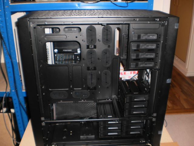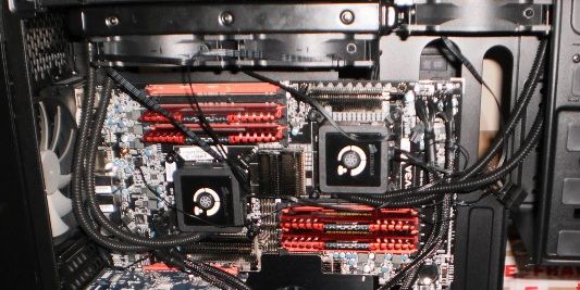 2 x 8Gb RAM (2x4 in each bank, one bank for each CPU) 2 H100's for cooling the CPU's 1 x HD7770 GPU a couple of extra fans to move the air around. Then connected all the power leads Following all the checks to ensure everything was in place and as expected, I powered it up! Yes! it worked. So shutdown again, connected the HDD & BR drive. restarted and installed Ubuntu 13.04. all went smoothly. The Interesting bit is going to be getting this monster in the case with 2 x H100's. In a case that will take them, but where? the H100's come as sealed units and do not have very long hoses on! Crunching tests After updating Ubuntu with all available patches, I installed Boinc, MGM (hardware monitoring utility) ![]() Yes! it worked! With the system proving stable, I left it to crunch for a few days the results are below: 12/17/2013 0:012:17:53:57 53,327 189 On to the installation in the case next... The case! ![]() Well, the case is a monster! The Corsair Obsidian 900D is a full tower case, one of few that will allow the new standard EGVA created with their SR-2 the HPTX This MB is huge at 13.6 x 15 inches it dwarfs even the XL-ATX which is only 13.5 x 10.3 inches So to the install First, line up the stand-off’s with the surprisingly few on the MB. Remove those that do not line up and install those that are missing. Install nylon stand-off’s where no screw hole is available. I guess this was by design as the nylon stand-off’s were supplied in the MB box. PSU installation – this fits nicely into the base of the case on it’s side with room for another one! Why I don’t know as this monster will provide 1200 watts! Airflow is provided by cleverly hidden vents in the lower panel of the case, which open for easy access. ![]() With the CPU & RAM already on the MB from the test build on the bench it made it easier. The fun was always going to be how to get both H100’s in the case with the restricted length on the hoses? Well I managed it by utilising the 4 x fan mounting point in the roof of the case. Specifically by overlapping the radiators and using the fans to make air flow across both at the same time! As seen in the picture below ![]() With the right radiator fitted against the case to the left side of the fourth fan mounting and the left fan fitted to the first fan location this left a level point to install the second radiator to the left fan and the right radiator. With additional fans on the right and on the left the installation was completed. Connecting the CPU Water blocks was the next challenge! Well, the only challenge turned out to be how flexible the hose was. With some careful manipulation, they both fitted! Phew! ![]() Installing the HDD was quick and easy in the caddy. I didn’t install the BR drive as it is not required. That’s pretty much it, I’d like to hear your comments, not specifically on the format of this thread, I’m not a reviewer or someone who writes documentation. I’ve done this as it was suggested some of you may find it interesting… So far the results are looking good 12/24/2013 0:011:23:01:28 45,146 151 While the CPU benchmark is not brilliant, this system does run 24 threads Tue 24 Dec 2013 18:48:16 GMT | | Benchmark results: I will add to this thread and answer any questions as replies.
