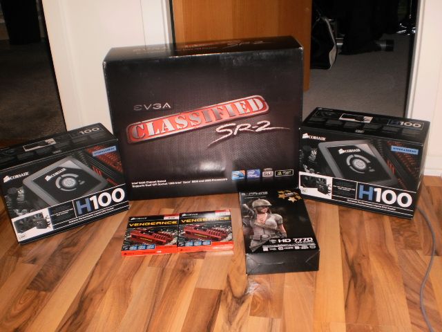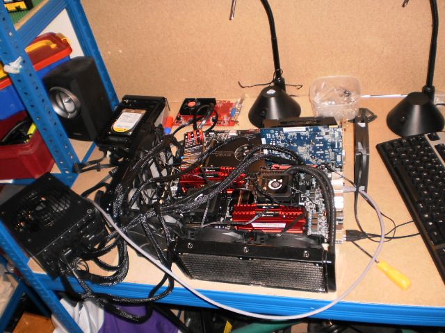 MB - EGVA SR-2 CPU - 2 x hex core xeon's (24 threads!) PSU Corsair AT1200i RAM - Corsair Vengeance red - 16Gb (SR2 max = 48Gb) HDD - 300Gb velociraptor (10k, enterprise drive, don't need storage in this system) GPU - Radeon HD7770, but may put my 2 x HD7970's in it! CPU Cooling - 2 x Corsair H100 Watercoolers ![]() Bench Build/Test Having not built a dual processor machine before I thought I would 'Play' on the bench first. This will help me get all the components into the MB and ensure they all work together. So I installed some 'stand-offs' on the back of the board, and looked over the new board and manual (yes, a male looking at the manual!) familiarised myself with the layout of the motherboard. Then installed (in this order)