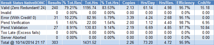 The wcg android stats overall are disappointing, just 346k credit for oct.13, also because the average copies needed for valid results dropped from 5.75 to 2.13, not 10 percent requiring an extra verification or repair copy, which is not far to what it is on the pc platforms for quorum 2. The tasks are truly short 4-6 hours with a mean of 4.5 hours, so where are you android crunchers, where have you gone? As the chart shows, no server aborts needed, no too late due too many errors, no invalid. ![]() Btw, it looks like rechencraft rulz the rankings on android. They seem to have figured it out. ![]() |