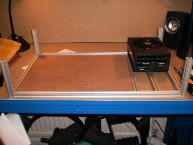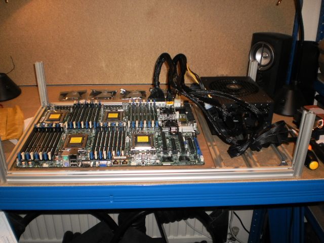 1 x Corsair AX1200i PSU - Already got it! 1 x Supermicro H8QG6-F motherboard Arrived 4 x AMD Opteron 6274 (8 core, 16 thread x 4 = 64!) Arrived! 4 x Noctua NH-U12DO A3 AMD Opteron CPU Cooler Socket G34 C32 F Heatsink Fan - Arrived! (before the temp passive ones) 2 x Corsair Vengeance 16GB 4X4GB Quad Channel DDR3 1600MHz PC3-12800 DIMM Desktop (8Gb per socket to start, if it needs more then it will get it!) Arrived! I'll start the build log in this post and answer questions as replies, your comments are most welcome! Hardware ![]() ![]() ![]() ![]() ![]() ![]() Processors are used and don't have boxes... Now to the Build Tray/case build underway ![]() Frame completed (just the base to add) ![]() ![]() Motherboard installed with main power connected - (cable routing needs sorting out) ![]() ![]() Processors, Memory & First Cooler installed ![]() ![]() That's it! All assembled and soon to be working! After some issues it was up and running. Early indications show, temps as between 28 & 34C. However, 2 of the coolers blow through the other 2, so could reduce this by changing the orientation of the coolers on the CPU, if there's space! And I have made some improvement by adding the other 2 CPU fans. This first registered on WCG just before 19:00 GMT and at the lunchtime update had matched enough work with the wingmen to amass 46.6k points. 01/20/2014 0:011:07:50:01 46,600 68 Power Running flat out, 64 FAAH threads the meter says just under 600 watts. Less than I was expecting! Noise, very quiet! actually quieter than my main Windows PC! Please feel free to ask any questions and make comments and observations... Note, as mentioned, my next build will be another on just like this! If it works out ok... I'm looking at making this an enclosed case with some sace fans etc. I'll post some pictures when I complete it. Tray size - (extenal) 64 x 39 cms approx Thanks for your intrest/advice and comments. It's been fun, here's to the next one! More to follow...
