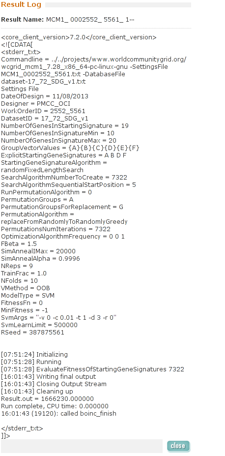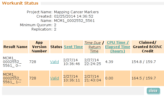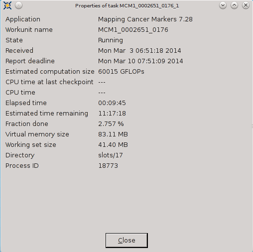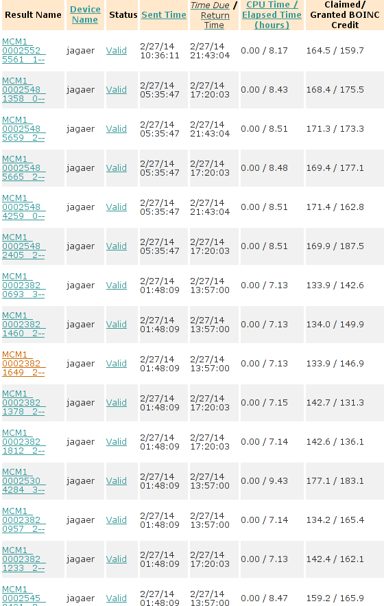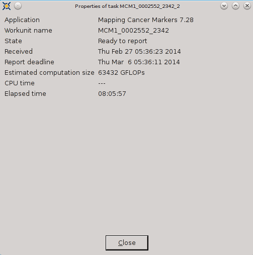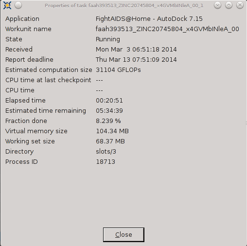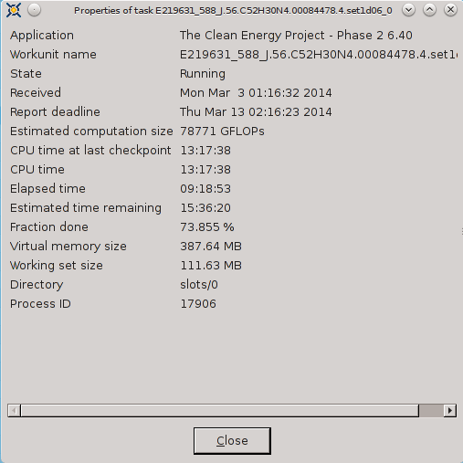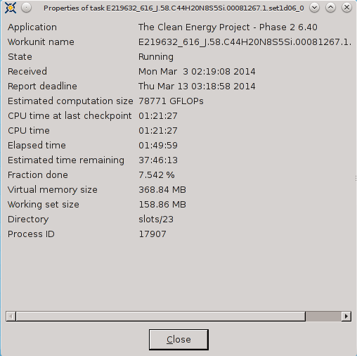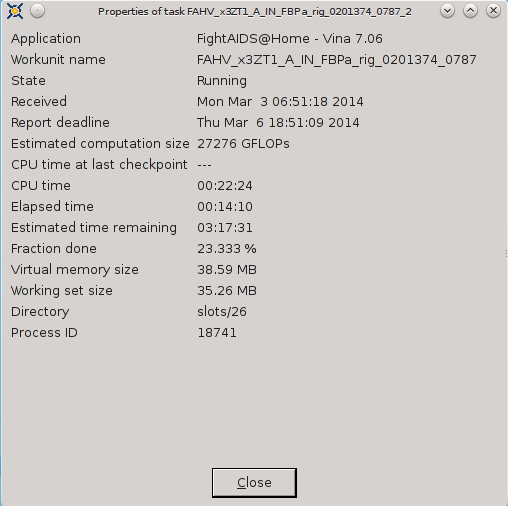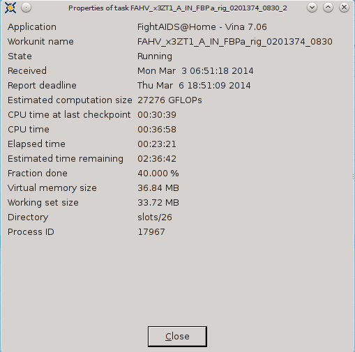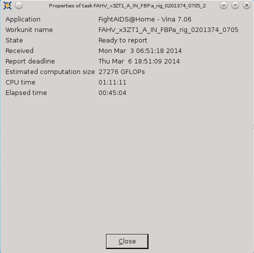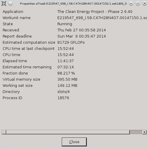 ----------------------------------------It appears that FAAH-Vina and CEP2 have CPU Time in advance of Elapsed time and FAAH-Autodock and MCM are not able to track CPU Time. ![]() ![]() ![]() ![]() ![]() ![]() 03-Mar-2014 17:08:29 [---] cc_config.xml not found - using defaults 03-Mar-2014 17:08:29 [---] Starting BOINC client version 7.2.42 for x86_64-pc-linux-gnu 03-Mar-2014 17:08:29 [---] log flags: file_xfer, sched_ops, task 03-Mar-2014 17:08:29 [---] Libraries: libcurl/7.35.0 OpenSSL/1.0.1f zlib/1.2.8 03-Mar-2014 17:08:29 [---] Data directory: /home/james/boincram boinc: /usr/lib64/libssl.so.1.0.0: no version information available (required by boinc) boinc: /usr/lib64/libcurl.so.4: no version information available (required by boinc) boinc: /usr/lib64/libcrypto.so.1.0.0: no version information available (required by boinc) 03-Mar-2014 17:08:29 [---] CUDA: NVIDIA GPU 0: GeForce GTX 580 (driver version unknown, CUDA version 6.0, compute capability 2.0, 3072MB, 2916MB available, 1581 GFLOPS peak) 03-Mar-2014 17:08:29 [---] OpenCL: NVIDIA GPU 0: GeForce GTX 580 (driver version 331.20, device version OpenCL 1.1 CUDA, 3072MB, 2916MB available, 1581 GFLOPS peak) 03-Mar-2014 17:08:29 [---] Host name: jagaer 03-Mar-2014 17:08:29 [---] Processor: 32 AuthenticAMD AMD Eng Sample, ZS222445TGG44_32/22/2_2/16 [Family 21 Model 1 Stepping 0] 03-Mar-2014 17:08:29 [---] Processor features: fpu vme de pse tsc msr pae mce cx8 apic sep mtrr pge mca cmov pat pse36 clflush mmx fxsr sse sse2 ht syscall nx mmxext fxsr_opt pdpe1gb rdtscp lm constant_tsc rep_good nopl nonstop_tsc extd_apicid amd_dcm aperfmperf pni pclmulqdq monitor ssse3 cx16 sse4_1 sse4_2 popcnt aes xsave avx lahf_lm cmp_legacy svm extapic cr8_legacy abm sse4a misalignsse 3dnowprefetch osvw ibs xop skinit wdt lwp fma4 nodeid_msr topoext perfctr_core perfctr_nb arat cpb hw_pstate npt lbrv svm_lock nrip_save tsc_scale vmcb_clean flushbyasid decodeassists pausefilter pfthreshold 03-Mar-2014 17:08:29 [---] OS: Linux: 3.11.4-pf 03-Mar-2014 17:08:29 [---] Memory: 62.91 GB physical, 0 bytes virtual 03-Mar-2014 17:08:29 [---] Disk: 10.00 GB total, 8.40 GB free 03-Mar-2014 17:08:29 [---] Local time is UTC -5 hours 03-Mar-2014 17:08:29 [---] VirtualBox version: 4.3.8_Gentoor92456 03-Mar-2014 17:08:29 [---] Version change (7.2.41 -> 7.2.42) 03-Mar-2014 17:08:29 [World Community Grid] URL http://www.worldcommunitygrid.org/; Computer ID 2787839; resource share 100 03-Mar-2014 17:08:29 [World Community Grid] General prefs: from World Community Grid (last modified 26-Feb-2014 06:13:26) 03-Mar-2014 17:08:29 [World Community Grid] Host location: none 03-Mar-2014 17:08:29 [World Community Grid] General prefs: using your defaults 03-Mar-2014 17:08:29 [---] Reading preferences override file 03-Mar-2014 17:08:29 [---] Preferences: 03-Mar-2014 17:08:29 [---] max memory usage when active: 48312.60MB 03-Mar-2014 17:08:29 [---] max memory usage when idle: 57975.12MB 03-Mar-2014 17:08:29 [---] max disk usage: 9.50GB 03-Mar-2014 17:08:29 [---] don't use GPU while active 03-Mar-2014 17:08:29 [---] (to change preferences, visit a project web site or select Preferences in the Manager) 03-Mar-2014 17:08:29 [---] Not using a proxy 03-Mar-2014 17:08:29 Initialization completed 03-Mar-2014 17:08:29 [---] Running CPU benchmarks 03-Mar-2014 17:08:29 [---] Suspending computation - CPU benchmarks in progress 03-Mar-2014 17:09:00 [---] Benchmark results: 03-Mar-2014 17:09:00 [---] Number of CPUs: 32 03-Mar-2014 17:09:00 [---] 1441 floating point MIPS (Whetstone) per CPU 03-Mar-2014 17:09:00 [---] 6839 integer MIPS (Dhrystone) per CPU 03-Mar-2014 17:09:01 [---] Suspending GPU computation - computer is in use 03-Mar-2014 17:17:17 [World Community Grid] Computation for task MCM1_0002646_3023_1 finished 03-Mar-2014 17:17:17 [World Community Grid] Starting task FAHV_x3ZT1_A_IN_FBPa_rig_0201374_0705_2 System Info: /proc/version cat /proc/version Linux version 3.11.4-pf (root@jagaer) (gcc version 4.7.3 (Gentoo 4.7.3-r1 p1.3, pie-0.5.5) ) #1 SMP PREEMPT Mon Nov 4 09:42:15 EST 2013 cat /etc/make.conf # These settings were set by the catalyst build script that automatically built this stage CFLAGS="-O2 -pipe -march=native" CHOST="x86_64-pc-linux-gnu" USE="amd64 kde qt4 qt3support alsa phonon oss multilib cdr dvd dvdr dvdread xine \ audacious usb udev dbus pam opengl xv mp3 ogg vorbis libsamplerate mad quicktime \ real wmp xvid x264 ffmpeg win32codecs nptl nptlonly lame encode dts a52 aac \ subversion X truetype history cups foomatic python mysql sqlite extensions sql \ nsplugin webkit mng accessibility declarative zip samba bzip2 jpeg gif tiff svg \ png lm_sensors caps gstreamer extras consolekit policykit tools \ virtualbox evdev vdpau vaapi ntfsprogs \ -dso -sis -rage128 -radeon -matrox -3dfx -gamma -i8x0 -gnome -gtk -hal -arts -pulseaudio -semantic-desktop" VIDEO_CARDS="nvidia" CXXFLAGS="${CFLAGS}" MAKEOPTS="-j32" CPU Info TurionPowerControl -l TurionPowerControl 0.44-rc2 (trunk-r177M) Turion Power States Optimization and Control - by blackshard Main processor is Family 15h (Bulldozer/Interlagos/Valencia) Processor Family: 0xf Model: 0x1 Stepping: 0x0 Extended Family: 0x15 Extended Model: 0x1 Package Type: 0x3 BrandId: 0x0 Machine has 4 nodes Processor has 8 cores Processor has 7 p-states Processor has 1 boost states Power States table: -- Node: 0 Core 0 core 0 pstate 0 (pb0) - Boost PState Disabled core 0 pstate 1 (p0) - En:1 VID:15 FID:22 DID:0.00 NBPS:0 Freq:3800 VCore:1.3625 core 0 pstate 2 (p1) - En:1 VID:43 FID:6 DID:0.00 NBPS:0 Freq:2200 VCore:1.0125 core 0 pstate 3 (p2) - En:1 VID:45 FID:4 DID:0.00 NBPS:1 Freq:2000 VCore:0.9875 core 0 pstate 4 (p3) - En:1 VID:47 FID:2 DID:0.00 NBPS:0 Freq:1800 VCore:0.9625 core 0 pstate 5 (p4) - En:1 VID:48 FID:0 DID:0.00 NBPS:0 Freq:1600 VCore:0.9500 core 0 pstate 6 (p5) - En:1 VID:50 FID:12 DID:1.00 NBPS:0 Freq:1400 VCore:0.9250 Memory Info: TurionPowerControl -dram TurionPowerControl 0.44-rc2 (trunk-r177M) Turion Power States Optimization and Co