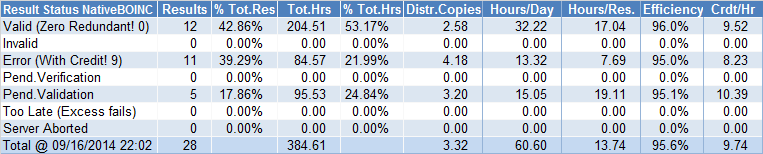 The latest standing, after 28 results. This device according nativeboinc -is- with version 7.16 in rac top 25 android devices for wcg http://nativeboinc.org/site/user_stats#order=rac&project=wcg mostly because the credits for failed tasks off the beta. Hope this does not turn into past tense, as from 84 percent success rate to 53 on results is not the right direction. That said, putting the super long tasks into the beta, longest now running 31 hours, due in 2 and far from finished, has turned the mobile into the locked to desktop, don't touch experience. Can't see that as working for too many.