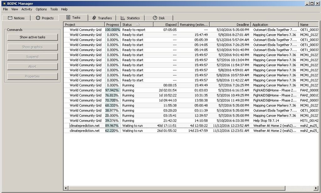 ok its summer time any my computer heating up the house is not good... i have a problem though i am getting fight aids and Genome work units that end up with longer times to complete than the return due by date... i am hopeing to get specific types of work units here but because of the options i can select the 1-2 projects i want and get none other and run out of work.. or select all but fight aids and genome and remove the other work and not get work units i want... eithor way it is almost impossible to get some work units without tons of manual controls and adjustments,,,and aborting of lots of work units. we either need to make longer times till work units expire.. or make the work units smaller OK, so run FAHB only...you get credited to every 10% you calculate towards the end of WU! also, check OET...maybe you can do some good there?! keep in mind of the "computer upgrade" & "pre-summer cleaning" of computers! ![]() |