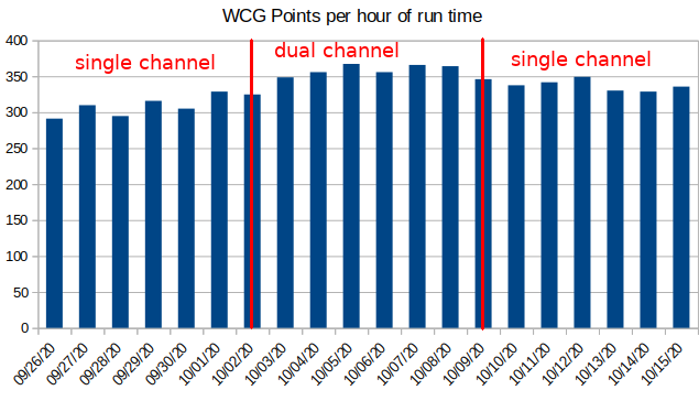 As expected, points decreased again, but not to levels as low as before. 360 points per hour of run time for the 6 days with dual channel memory 15.5% (308 points) less for the 6 days before with single channel memory 6.2% (337 points) less for the 6 days thereafter with single channel memory (I excluded the days when I made the switch from the calculation) As mentioned before, 14 units SCC and 2 units MIP were running during the whole period. Results for other projects mix can be completely different. ![]() So it seems not to be clear how large the benefit of dual channel memory with my SCC/MIP project mix is, but it seems to be likely, that there is one. Even if the benefit is only 6%, it seems to be worth it. 2x4 GB instead of 1x4GB increases the overall cost of a cruncher by a similar amount. Electricity consumtion, which is a major cost factor, increases by approx. 1.5 W with 2x4 GB instead of 1x4 GB, which is only 2% of the current consumption of 75 W that my crunchers have. So in the future I will build new crunchers with dual channel. |