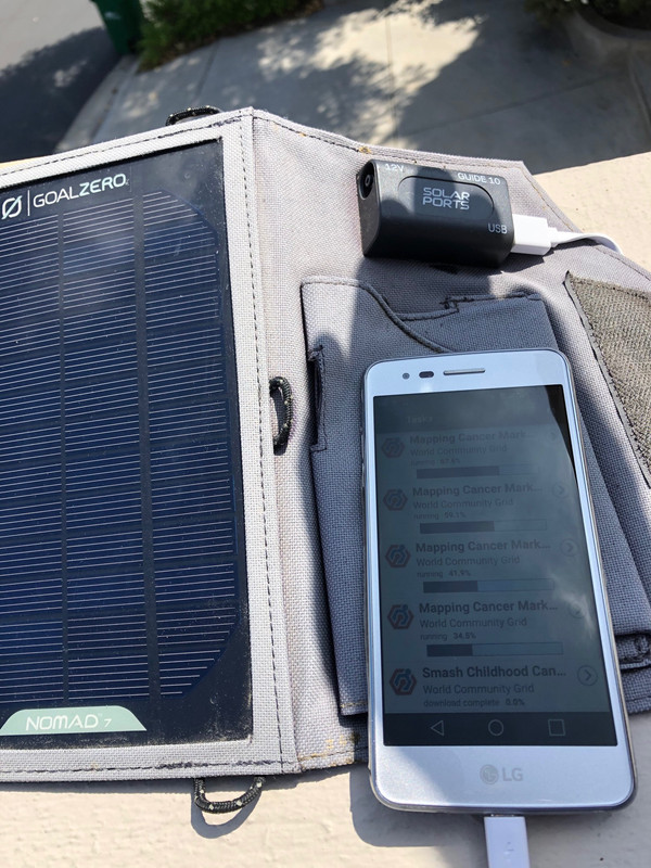 ----------------------------------------I just wanted to share a little project I have been running. I have an old LG Android phone that I have tethered to a portable USB solar panel running WCG/BOINC. The LG runs BOINC all day an into the night. It charges via the solar panel during the day, and manages to also charge itself well enough to get to 100%. I'm actually not sure how long it runs at night, but I have BOINC set to run on battery until it gets down to 20%. It stays alive until the sun comes up the next morning. I've been doing it off and on (mostly off lately because of bad weather) for over a year. I can't even get T-mobile to unlock it, so I just use it over wi-fi. I'm curious if there is a battery pack/solar combo that would let the phone run off of solar during the day and battery at night (but could both charge the battery and run the phone during the day?) I know mobile phones aren't the most powerful of platforms, but I think it's a fun proof of concept for truly "free" CPU cycles. I had bought the phone on eBay as a cheap burner phone and to test BOINC on it (I use an iPhone for mobile) since they use so little power, but T-Mobile jerks won't unlock it. Then I realized that I had this portable solar panel for the beach and other travel, so I thought I'd try the two together. You can get them pretty cheap on sale on Amazon. I'd imagine some of the more powerful mobile CPUs would draw too much power for this, but who knows? I have a Moto E6 I'm going to try with a slightly more powerful portable solar panel I have. At some point I'd like to do a small off-grid roof mounted solar array that I could use for my laptop, which is an i9 with 8 cores and robust GPU (RTX 2080 @ 990mhz). But it would need some external batteries to keep going overnight (240W power supply! ). Plus HOA hassles to approve solar. Maybe I could do a panel or two on my balcony and just use it during daytime.I think I'll start with a solar powered laptop cooler. This thing gets HOT when crunching all 8 cores and the GPU! ![]() [Edit 1 times, last edit by uclajd at May 2, 2020 6:21:59 PM] |