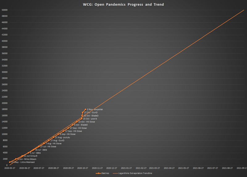 1000 Little Mermaid 27 May 2000 Mike.Gibson 9 June 3000 Sirius B 22 June 4000 daka 5 July 5000 daka 16 July 6000 HK-Steve 27 July 7000 HK-Steve 7 August 8000 GunZi 17 August 9000 pututu 27 August 10000 HK-Steve 6 September 11000 HK-Steve 17 September 12000 HK-Steve 27 September 13000 BladeD 6 October 14000 HK-Steve 15 October 15000 yoerik 25 October 16000 BladeD 26 October 17000 GunZi 27 October 18000 awpollak 2 November a new entrant to the opn leader board Who will report the first 19000? Possibly about 8 November. As there are reportedly 50,000 batches, this would represent 36% of the first target, once we have returned more over 18000s than there are under incomplete. Also dependent on whether those missing units are returned. Estimated completion date for the first target is 4 September 2021. I haven't revised this date because I suspect that we will catch up on the missing batches later. Once the interval between 1000s stabilises, a new target can be estimated. Mike |