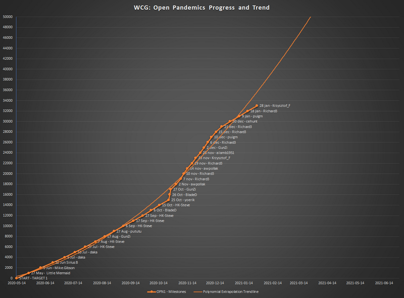 1000 Little Mermaid 27 May 2000 Mike.Gibson 9 June 3000 Sirius B 22 June 4000 daka 5 July 5000 daka 16 July 6000 HK-Steve 27 July 7000 HK-Steve 7 August 8000 GunZi 17 August 9000 pututu 27 August 10000 HK-Steve 6 September 11000 HK-Steve 17 September 12000 HK-Steve 27 September 13000 BladeD 6 October 14000 HK-Steve 15 October 15000 yoerik 25 October 16000 BladeD 26 October 17000 GunZi 27 October 18000 awpollak 2 November 19000 Richard3 7 November 20000 Richard3 10 November 21000 awpollak 14 November 22000 Richard3 19 November 23000 Krzysztof_F 23 November 24000 alamb1951 28 November 25000 GunZi 2 December 26000 Richard3 6 December 27000 puigm 10 December 28000 Richard3 15 December 29000 Richard3 21 December 30000 cehunt 30 December 31000 puigm 9 January 32000 Richard3 18 January 33000 Krzysztof_F 28 January Who will report the first 34,000? Possibly about 7 February. As there are reportedly 50,000 batches, this would represent 66% of the first target, once we have returned more over 33000s than there are under, incomplete. The interval is still double what it was and shows no signs of decreasing. The number of units being crunched has remained steady at just over 1 million per day. Based on the last 10 intervals my forecast for completion of the first target is adjusted to 3 June 2021, but based on the last 4 intervals it would be 27 July 2021. Expect something in between. Mike |