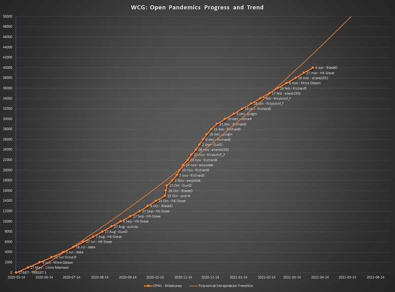 1000 Little Mermaid 27 May 2000 Mike.Gibson 9 June 3000 Sirius B 22 June 4000 daka 5 July 5000 daka 16 July 6000 HK-Steve 27 July 7000 HK-Steve 7 August 8000 GunZi 17 August 9000 pututu 27 August 10000 HK-Steve 6 September 11000 HK-Steve 17 September 12000 HK-Steve 27 September 13000 BladeD 6 October 14000 HK-Steve 15 October 15000 yoerik 25 October 16000 BladeD 26 October 17000 GunZi 27 October 18000 awpollak 2 November 19000 Richard3 7 November 20000 Richard3 10 November 21000 awpollak 14 November 22000 Richard3 19 November 23000 Krzysztof_F 23 November 24000 alanb1951 28 November 25000 GunZi 2 December 26000 Richard3 6 December 27000 puigm 10 December 28000 Richard3 15 December 29000 Richard3 21 December 30000 cehunt 30 December 31000 puigm 9 January 32000 Richard3 18 January 33000 Krzysztof_F 28 January 34001 Krzysztof_F 7 February 35000 alanb1951 17 February 36000 Richard3 26 February 37000 Mike.Gibson 8 March 38000 alanb1951 18 March 39000 HK-Steve 27 March 40000 BladeD 6 April Who will report the first 41,000? Possibly about 16 April. As there are reportedly 50,000 batches, this would represent 80% of the first target, once we have returned more over 40000s than there are under, incomplete. Based on the last 10 intervals, my forecast for the end of the first target adjusts slightly to 28 July 2021, ignoring any GPU live work. The last 8 forecasts have all been within a day of that. Mike |