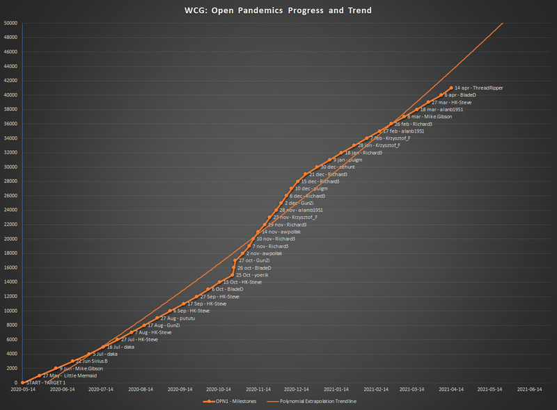 ----------------------------------------1000 Little Mermaid 27 May 2000 Mike.Gibson 9 June 3000 Sirius B 22 June 4000 daka 5 July 5000 daka 16 July 6000 HK-Steve 27 July 7000 HK-Steve 7 August 8000 GunZi 17 August 9000 pututu 27 August 10000 HK-Steve 6 September 11000 HK-Steve 17 September 12000 HK-Steve 27 September 13000 BladeD 6 October 14000 HK-Steve 15 October 15000 yoerik 25 October 16000 BladeD 26 October 17000 GunZi 27 October 18000 awpollak 2 November 19000 Richard3 7 November 20000 Richard3 10 November 21000 awpollak 14 November 22000 Richard3 19 November 23000 Krzysztof_F 23 November 24000 alanb1951 28 November 25000 GunZi 2 December 26000 Richard3 6 December 27000 puigm 10 December 28000 Richard3 15 December 29000 Richard3 21 December 30000 cehunt 30 December 31000 puigm 9 January 32000 Richard3 18 January 33000 Krzysztof_F 28 January 34001 Krzysztof_F 7 February 35000 alanb1951 17 February 36000 Richard3 26 February 37000 Mike.Gibson 8 March 38000 alanb1951 18 March 39000 HK-Steve 27 March 40000 BladeD 6 April 41000 ThreadRipper 14 April New Entrant but Chartist. Who will report the first 42,000? Possibly about 23 April. As there are reportedly 50,000 batches, this would represent 82% of the first target, once we have returned more over 41000s than there are under, incomplete. Based on the last 10 intervals, my forecast for the end of the first target adjusts to 24 July 2021. The first deviation by more than a day for a while. Mike [Edit 1 times, last edit by Mike.Gibson at Apr 15, 2021 1:53:22 AM] |