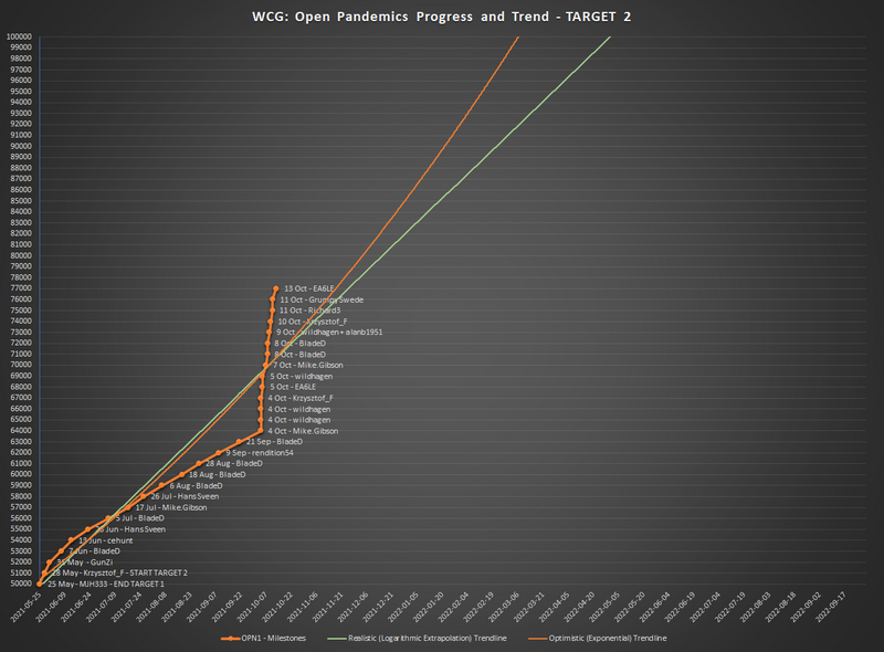 1000 Little Mermaid 27 May 2000 Mike.Gibson 9 June 3000 Sirius B 22 June 4000 daka 5 July 5000 daka 16 July 6000 HK-Steve 27 July 7000 HK-Steve 7 August 8000 GunZi 17 August 9000 pututu 27 August 10000 HK-Steve 6 September 11000 HK-Steve 17 September 12000 HK-Steve 27 September 13000 BladeD 6 October 14000 HK-Steve 15 October 15000 yoerik 25 October 16000 BladeD 26 October 17000 GunZi 27 October 18000 awpollak 2 November 19000 Richard3 7 November 20000 Richard3 10 November 21000 awpollak 14 November 22000 Richard3 19 November 23000 Krzysztof_F 23 November 24000 alanb1951 28 November 25000 GunZi 2 December 26000 Richard3 6 December 27000 puigm 10 December 28000 Richard3 15 December 29000 Richard3 21 December 30000 cehunt 30 December 31000 puigm 9 January 32000 Richard3 18 January 33000 Krzysztof_F 28 January 34001 Krzysztof_F 7 February 35000 alanb1951 17 February 36000 Richard3 26 February 37000 Mike.Gibson 8 March 38000 alanb1951 18 March 39000 HK-Steve 27 March 40000 BladeD 6 April 41000 ThreadRipper 14 April 42000 Mike.Gibson 19 April 43000 Krzysztof_F 22 April 44000 BladeD 25 April 45000 GunZi 30 April 46000 Krzysztof_F 5 May 47000 yoerik 10 May 48000 GunZi 16 May 49000 alanb1951 21 May 50000 MJH333 25 May 51000 Krzysztof_F 28 May 52000 GunZi 31 May 53000 BladeD 7 June 54000 cehunt 13 June 55000 Hans Sveen 23 June 56000 BladeD 5 July 57000 Mike.Gibson 17 July 58000 Hans Sveen 26 July 59000 BladeD 6 August 60000 BladeD 18 August 61000 BladeD 28 August 62000 rendition54 9 September 63000 BladeD 21 September 64000 Mike.Gibson 4 October 65000 wildhagen 4 October 66000 wildhagen 4 October 67000 Krzysztof_F 4 October 68000 EA6LE 5 October 69000 wildhagen 5 October 70000 Mike.Gibson 7 October 71000 BladeD 8 October 72000 BladeD 8 October 73000 alanb1951 7 October 74000 Krzysztof_F 10 October 75000 Richard3 11 October 76000 Grumpy Swede 11 October 77000 EA6LE 13 October Who will report the first 78,000? Probably in the next day. The latest interval is up to 1.1476 days. The 3 interval average is also up to 0.9666 days. It will again be over the last 10 intervals once we have 10. . We still need more information on what happens next. The forecasting will be unable to restart without it. Mike |