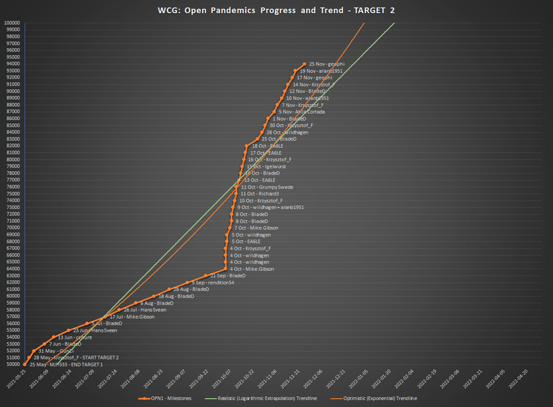 1000 Little Mermaid 27 May 2000 Mike.Gibson 9 June 3000 Sirius B 22 June 4000 daka 5 July 5000 daka 16 July 6000 HK-Steve 27 July 7000 HK-Steve 7 August 8000 GunZi 17 August 9000 pututu 27 August 10000 HK-Steve 6 September 11000 HK-Steve 17 September 12000 HK-Steve 27 September 13000 BladeD 6 October 14000 HK-Steve 15 October 15000 yoerik 25 October 16000 BladeD 26 October 17000 GunZi 27 October 18000 awpollak 2 November 19000 Richard3 7 November 20000 Richard3 10 November 21000 awpollak 14 November 22000 Richard3 19 November 23000 Krzysztof_F 23 November 24000 alanb1951 28 November 25000 GunZi 2 December 26000 Richard3 6 December 27000 puigm 10 December 28000 Richard3 15 December 29000 Richard3 21 December 30000 cehunt 30 December 31000 puigm 9 January 32000 Richard3 18 January 33000 Krzysztof_F 28 January 34001 Krzysztof_F 7 February 35000 alanb1951 17 February 36000 Richard3 26 February 37000 Mike.Gibson 8 March 38000 alanb1951 18 March 39000 HK-Steve 27 March 40000 BladeD 6 April 41000 ThreadRipper 14 April 42000 Mike.Gibson 19 April 43000 Krzysztof_F 22 April 44000 BladeD 25 April 45000 GunZi 30 April 46000 Krzysztof_F 5 May 47000 yoerik 10 May 48000 GunZi 16 May 49000 alanb1951 21 May 50000 MJH333 25 May 51000 Krzysztof_F 28 May 52000 GunZi 31 May 53000 BladeD 7 June 54000 cehunt 13 June 55000 Hans Sveen 23 June 56000 BladeD 5 July 57000 Mike.Gibson 17 July 58000 Hans Sveen 26 July 59000 BladeD 6 August 60000 BladeD 18 August 61000 BladeD 28 August 62000 rendition54 9 September 63000 BladeD 21 September 64000 Mike.Gibson 4 October 65000 wildhagen 4 October 66000 wildhagen 4 October 67000 Krzysztof_F 4 October 68000 EA6LE 5 October 69000 wildhagen 5 October 70000 Mike.Gibson 7 October 71000 BladeD 8 October 72000 BladeD 8 October 73000 alanb1951 7 October 74000 Krzysztof_F 10 October 75000 Richard3 11 October 76000 Grumpy Swede 11 October 77000 EA6LE 13 October 78000 BladeD 14 October 79000 Igelwurst 15 October 80000 Krzysztof_F 16 October 81000 EA6LE 17 October 82000 EA6LE 18 October 83000 BladeD 25 October 84000 wildhagen 28 October 85000 Krzysztof_F 30 October 86000 BladeD 1 November 87000 Atila Cortada 5 November 88000 Krzysztof_F 7 November 89000 alanb1951 10 November 90000 BladeD 12 November 91000 Krzystof_F 14 November 92000 geophi 17 November a new entrant-welcome 93000 alanb1951 19 November 94000 geophi 25 November Who will report the first 95,000? Possibly 30 November. The latest interval is substantially up to 5.2947 days.and the 10-interval average is up to 2.7889 days. The batches have regularly been in the 1000+ units. We still need more information on what happens next. The forecasting will be unable to restart without it. Mike |