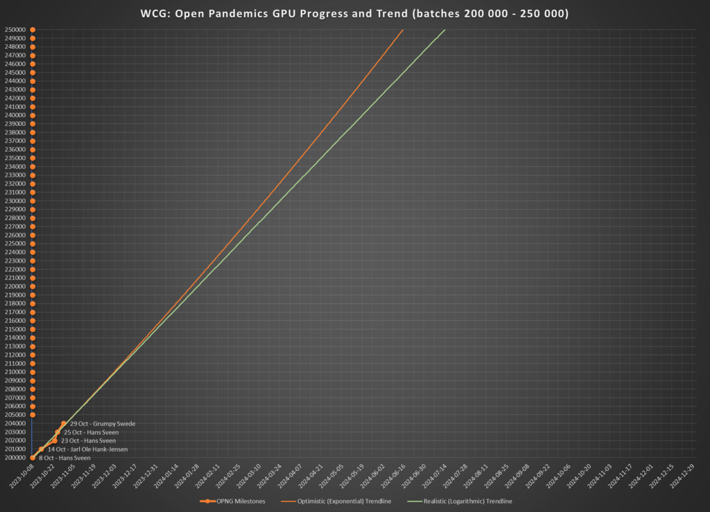 ----------------------------------------Time for an updated graph. It seems that at this rate we will reach batch 250 000 sometime in June or July 2024. However, since we are only at the beginning of this chart, things might change rapidly. Also, may I come with a wish that if you re-use your posts by editing and adding entries, please do so, but when you see that you are crossing a new 1000-batch border, create a new post. That will make it a lot more possible for me to track who was first to report. Thank you in advance! Image link: https://i.postimg.cc/nLfdbcgZ/OPNG-250000.png ![]() ![]() Join The International Team: https://www.worldcommunitygrid.org/team/viewTeamInfo.do?teamId=CK9RP1BKX1 AMD TR2990WX @ PBO, 64GB Quad 3200MHz 14-17-17-17-1T, RX6900XT @ Stock AMD 3800X @ PBO AMD 2700X @ 4GHz |