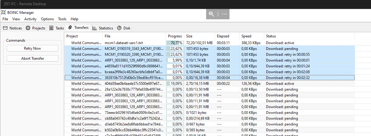 Started getting lots of wu's yesterday. Now i look and all my rigs have lots of pending downloads and uploads in the "transfers" in BM Any thoughts on this? Thanks SystemViper Hi SystemViper, some of our upload/download servers are affected by the networking issue and thus file transfers may be throttled when server resources are not available to handle them. |