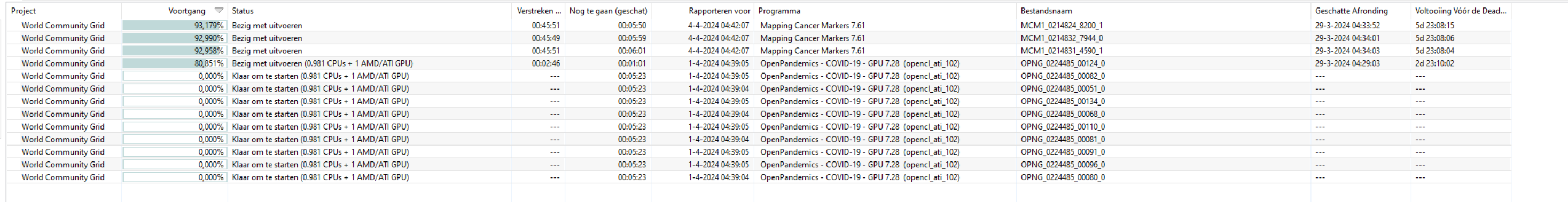 Can I ask what processor it is? If there are 32 threads and you have an estimated time for tasks around 50 minutes, then it is probably a fast CPU? This might be part of the reason. Do you get "bunches" of work (around 10 to 15), or are you returning one work unit and getting one back? It's AMD Ryzen 5950X 16-core/32 threads, running (with boost) at 3.9 Ghz. Not the newest generation (that would be the 7950X), bur still pretty fast indeed. Mostly I received bunches of work indeed, varying from 5 to 15 Workunits. But sporadically I get only 1 or 2 WU's at a time when I report some back. Or nothing at all, as is the case now: 29-3-2024 05:21:02 | World Community Grid | Requesting new tasks for CPU and AMD/ATI GPU 29-3-2024 05:21:03 | World Community Grid | Scheduler request completed: got 0 new tasks 29-3-2024 05:21:03 | World Community Grid | No tasks sent 29-3-2024 05:21:03 | World Community Grid | No tasks are available for OpenPandemics - COVID 19 29-3-2024 05:21:03 | World Community Grid | No tasks are available for OpenPandemics - COVID-19 - GPU 29-3-2024 05:21:03 | World Community Grid | No tasks are available for Africa Rainfall Project 29-3-2024 05:21:03 | World Community Grid | No tasks are available for Help Stop TB 29-3-2024 05:21:03 | World Community Grid | No tasks are available for Mapping Cancer Markers 29-3-2024 05:21:03 | World Community Grid | No tasks are available for Smash Childhood Cancer 29-3-2024 05:21:03 | World Community Grid | Project requested delay of 121 seconds 29-3-2024 05:22:04 | World Community Grid | Sending scheduler request: To fetch work. 29-3-2024 05:22:04 | World Community Grid | Requesting new tasks for CPU and AMD/ATI GPU 29-3-2024 05:22:05 | World Community Grid | Scheduler request completed: got 0 new tasks I find this pretty annoying to be honest... |