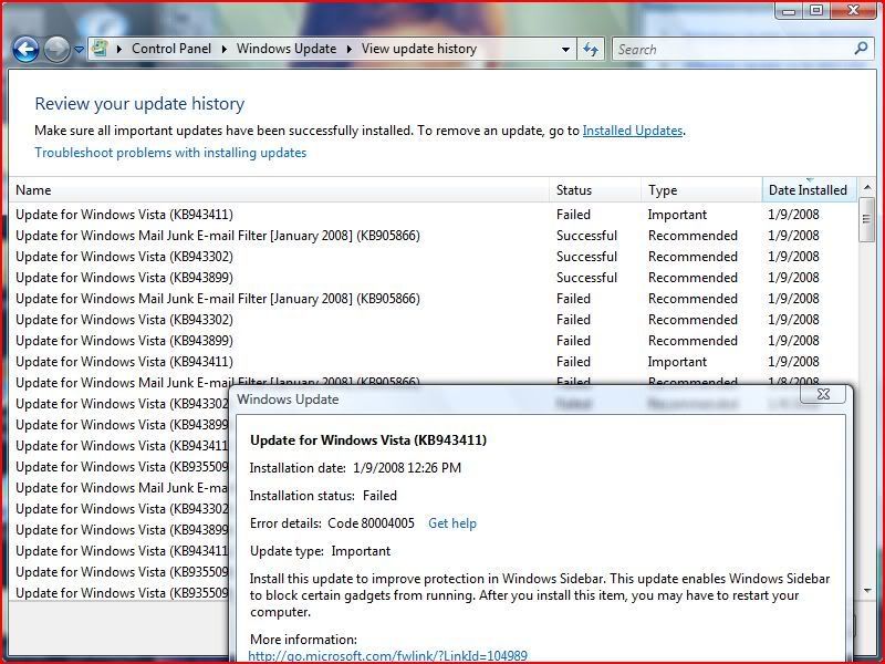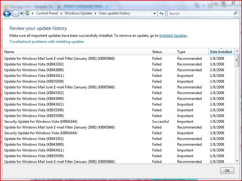 ----------------------------------------Reopen Windows Update and click on Show Chronology. It should list a status of the failed installs (click on them). Theoretically the updates are already on your harddisk. Over here things went smooth, the only odd thing being that this machine was off from the 19th thru the 6th, yet gremlins got in and installed something on the 3rd. Did the machine auto-revive and shut down? More irritating, the Update setting is explicitly to only alert for updates and not install and it still went ahead unattended yesterday and installed and booted 10 minutes after. Wonder what squirmin' will come out of Redmond this month on that. Need to 'sack' Bill G. before he finally retires in June http://img530.imageshack.us/img530/7360/vistaupdatechroniclesrd9.png