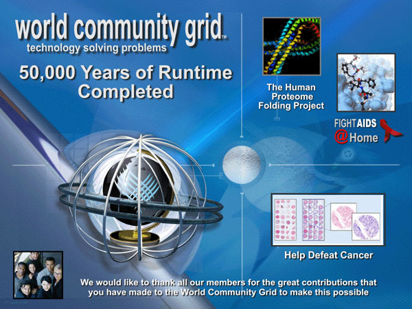 ----------------------------------------Recently we crossed a significant milestone. Our virtual community of World Community Grid volunteers has racked up a whopping 50,000 years of computer time! This incredible achievement has been a great start for the Help Defeat Cancer project and for the continued work on the FightAIDS@Home and Human Proteome Folding - Phase 2 projects. Congratulations and thank you for your contributions. We look forward to even greater accomplishments. ![]() Thank you Graham for providing the image. [Edit 3 times, last edit by knreed at Jul 27, 2006 9:02:59 PM] |